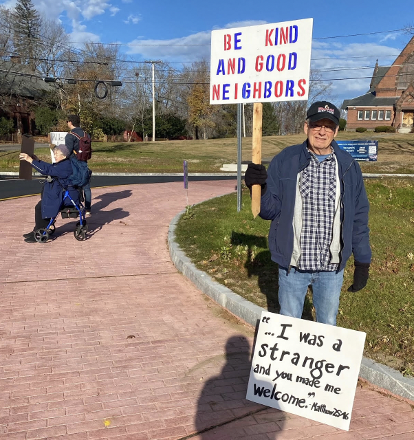 “We’ve had some cold days and some wet days, but it’s just an hour,” he said. “And people drive by and honk or give us a thumbs up. The first Saturday we were out here someone brought us coffee and others stopped to take photos to show their congregation. Every week so many people slow down to shout out a thank you. It has helped me realize that there are many more kind and generous people in Gardner than there are close-minded and mean ones.”